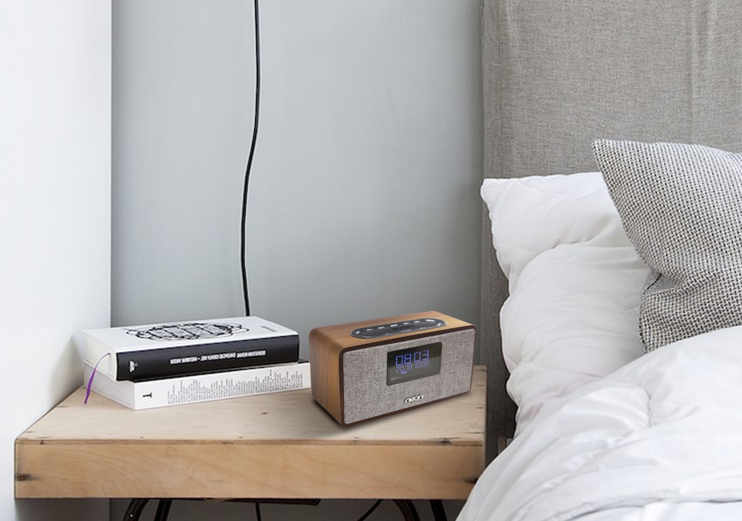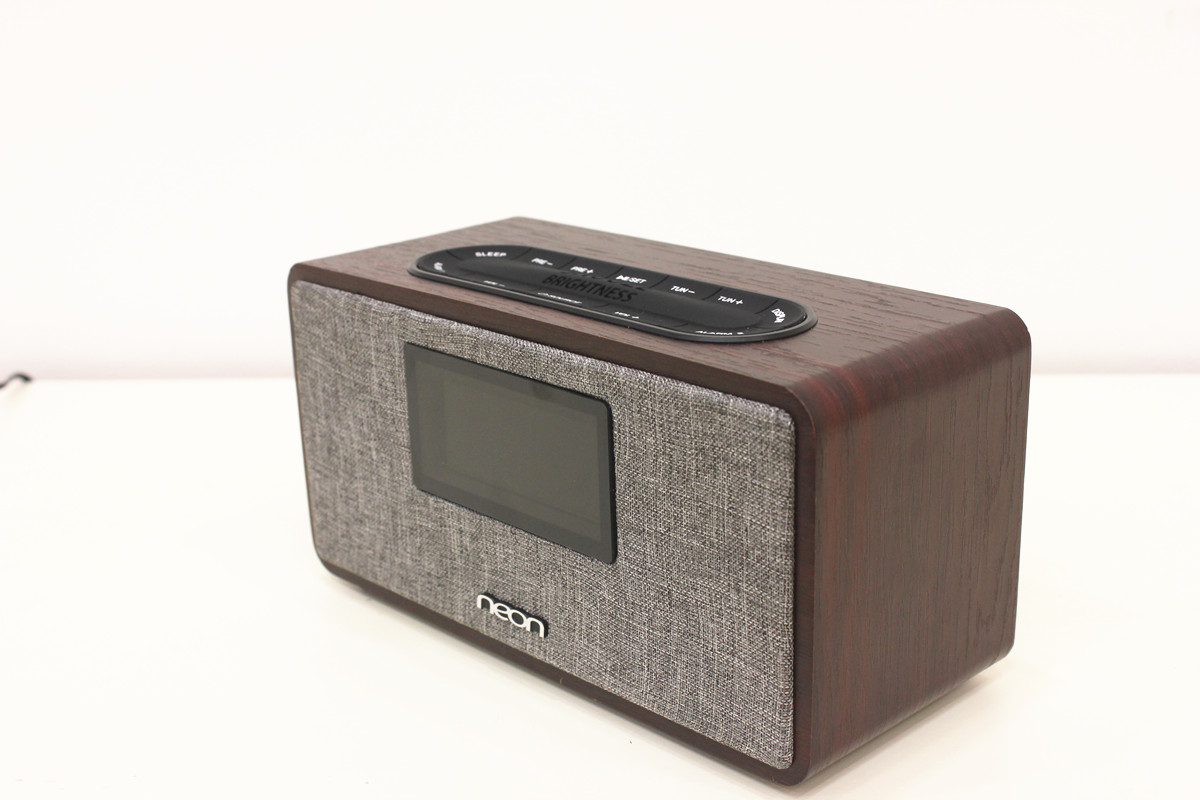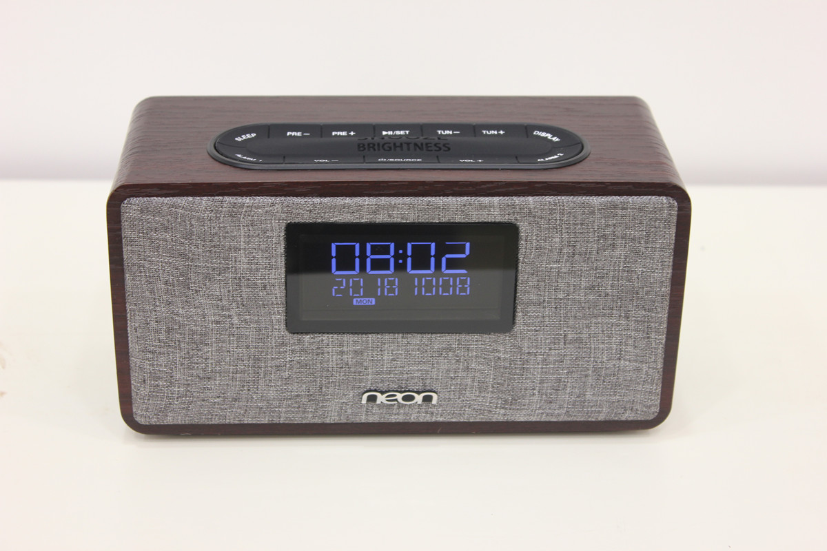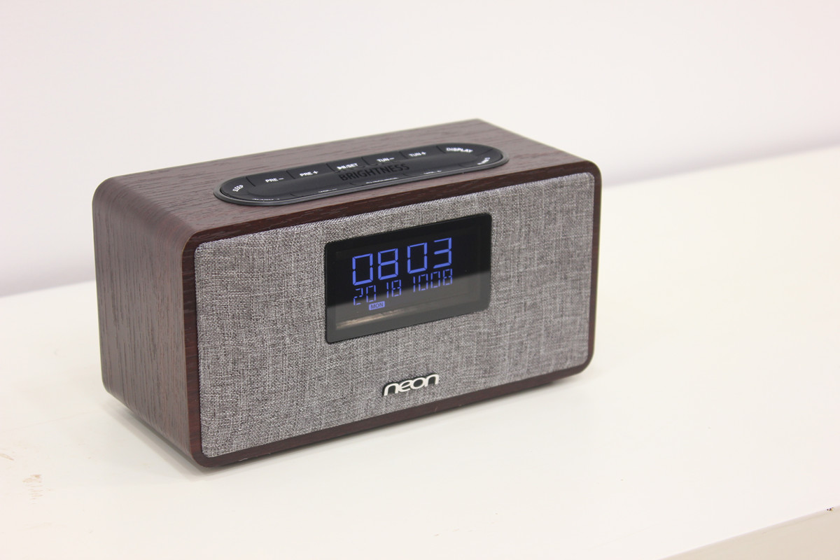 ● USB for charging 5V1A ● 10W*2 RMS● Dimensions: (D) 78 x (W) 183 x (H) 90mm聲音超級(jí)好聽(tīng)的大功率桌面實(shí)木藍(lán)牙鐘機(jī),音質(zhì)優(yōu)秀,低音強(qiáng)勁,實(shí)木外觀(guān),布藝面板,居家良品